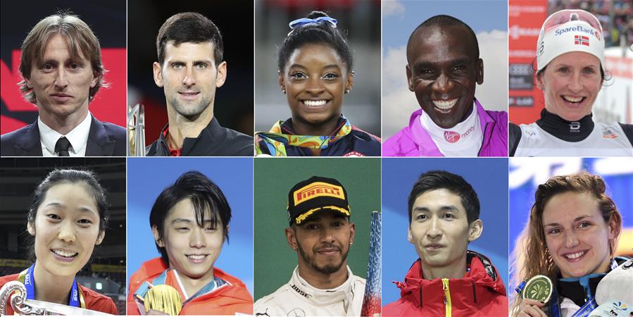 拼版照片上排從左至右為:盧卡·莫德里奇、諾瓦克·焦科維奇、西蒙·拜爾斯、埃魯?shù)隆せ諉谈瘛⒈燃s根;下排從左至右為:朱婷、羽生結弦、劉易斯·漢密爾頓、武大靖、霍蘇。 新華社發(fā)