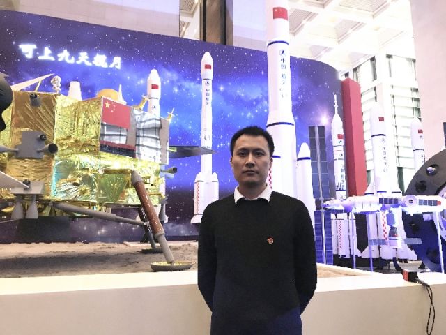 何巍在“偉大的變革——慶祝改革開放40周年”大型展覽的長征系列火箭展區,接受媒體采訪。新華社記者屈婷攝