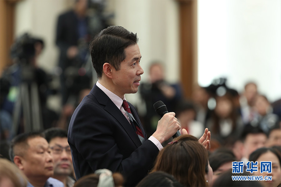 3月4日,十三屆全國人大一次會議在人民大會堂新聞發布廳舉行新聞發布會,由大會發言人張業遂就大會議程和人大工作相關的問題回答中外記者的提問。圖為CNN記者提問。新華網/中國政府網 翟子赫 攝