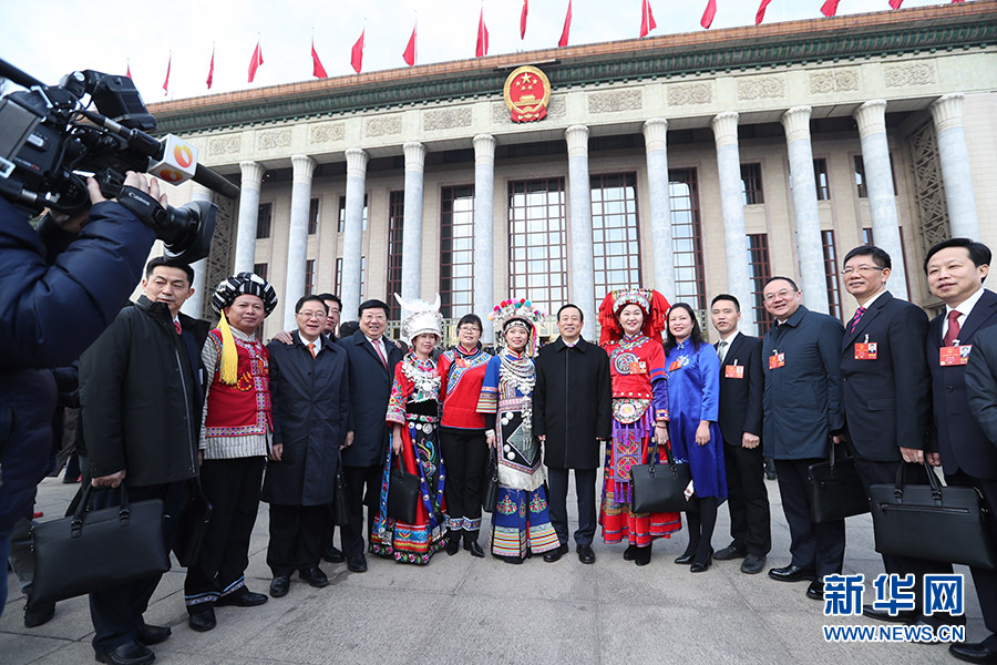 3月5日,第十三屆全國(guó)人民代表大會(huì)第一次會(huì)議在北京人民大會(huì)堂開幕。這是代表們?cè)谌嗣翊髸?huì)堂前合影。 新華網(wǎng)/中國(guó)政府網(wǎng) 翟子赫攝