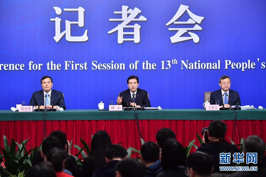 3月11日,十三屆全國人大一次會議新聞中心舉行記者會,邀請商務部部長鐘山、副部長兼國際貿易談判副代表王受文、副部長錢克明就“推動形成全面開放新格局推動商務事業高質量發展”相關問題回答中外記者提問。 新華社記者 李鑫 攝