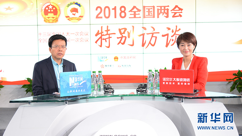 圖為全國政協委員,陜西建工集團有限公司黨委書記、董事長、總經理張義光(左)做客新華網2018全國兩會特別訪談。新華網 楊濛攝