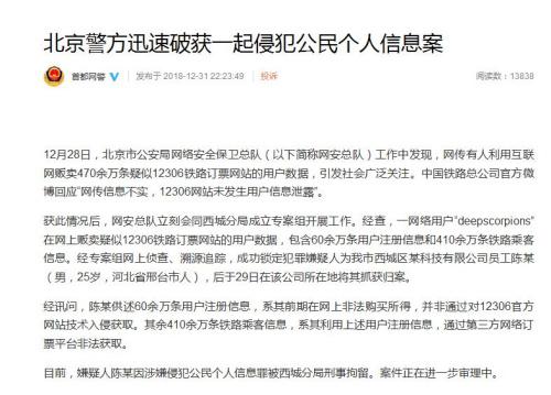 據北京市公安局網絡安全保衛總隊微博消息,北京警方破獲一起侵犯公民個人信息案,網上販賣470余萬條疑似12306鐵路訂票網站用戶數據的犯罪嫌疑人陳某,已被刑拘。