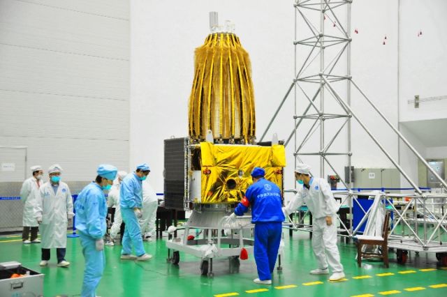 發(fā)射前的鵲橋號(hào)中繼衛(wèi)星。(中國航天科技集團(tuán)五院供圖)