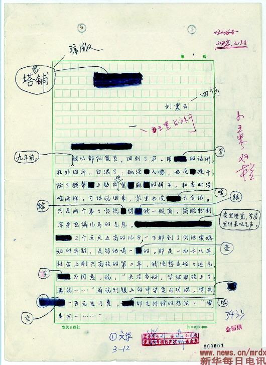 陳列于中國現(xiàn)代文學(xué)館的劉震云成名作《塔鋪》的手稿。