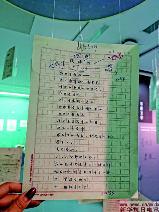 舒婷的詩歌代表作《致橡樹》就寫在42年前的兩頁“北京市電車公司印刷廠”印制的紅色格子稿紙上。如今它被串上線,懸掛在中國現(xiàn)代文學(xué)館的展廳中央。