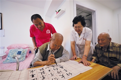 去年9月12日,安貞街道安華怡園養(yǎng)老照料中心開(kāi)門(mén)迎客,入住老人在房間里練習(xí)書(shū)法。資料圖片/記者 王飛 攝