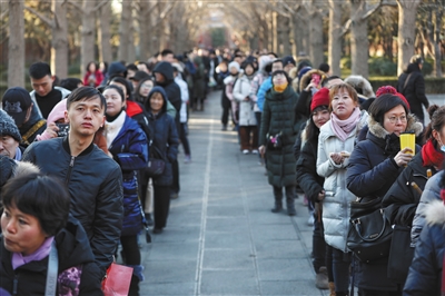 1月13日,雍和宮內百米甬道,市民排隊等待領取臘八粥。