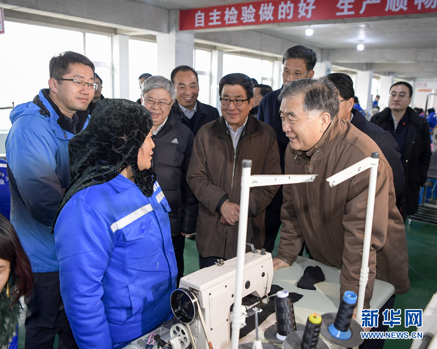 近日,中共中央政治局常委、全國政協主席汪洋在甘肅臨夏回族自治州調研脫貧攻堅工作,看望慰問貧困群眾和基層扶貧干部。這是1月14日,汪洋在和政縣考察扶貧車間,調研東西部扶貧協作情況。 新華社記者 李學仁 攝
