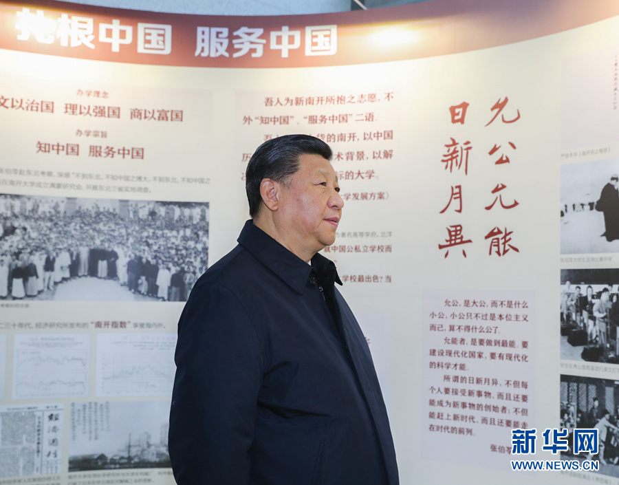 17日上午,習近平來到天津南開大學考察調研。南開大學成立于1919年,是一所具有光榮愛國傳統的名校。習近平參觀了校史展覽,詳細了解南開大學歷史沿革、學科建設、人才隊伍、科研創新等情況。習近平指出,學校是立德樹人的地方。愛國主義是中華民族的民族心、民族魂,培養社會主義建設者和接班人,首先要培養學生的愛國情懷。高校黨組織要把抓好學校黨建工作和思想政治工作作為辦學治校的基本功。習近平同在現場的部分院士、專家及中青年教師代表進行了交流。他指出,專家型教師隊伍是大學的核心競爭力。要把建設政治素質過硬、業務能力精湛、育人水平高超的高素質教師隊伍作為大學建設的基礎性工作,始終抓緊抓好。在元素有機化學國家重點實驗室,他強調,要加快一流大學和一流學科建設,加強基礎研究,力爭在原始創新和自主創新上出更多成果,勇攀世界科技高峰。他勉勵師生們把學習奮斗的具體目標同民族復興的偉大目標結合起來,把小我融入大我,立志作出我們這一代人的歷史貢獻。走出實驗室,廣場上擠滿了學生,大家高呼“總書記好”、“總書記辛苦”,齊聲高喊“愛我中華、振興中華”,還唱起《我和我的祖國》。習近平同近處的同學親切握手,向遠處的同學們招手致意。掌聲、歌聲、歡呼聲在校園里久久回蕩。