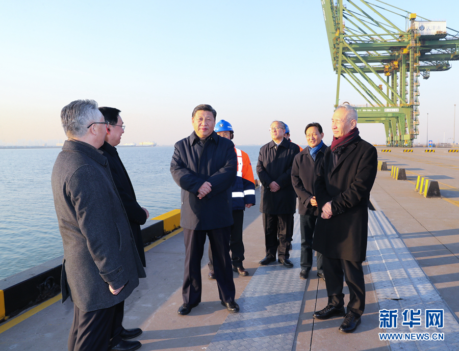 1月16日至18日,中共中央總書記、國家主席、中央軍委主席習近平在京津冀考察,主持召開京津冀協同發展座談會并發表重要講話。這是1月17日下午,習近平在天津港碼頭考察。 新華社記者 鞠鵬 攝