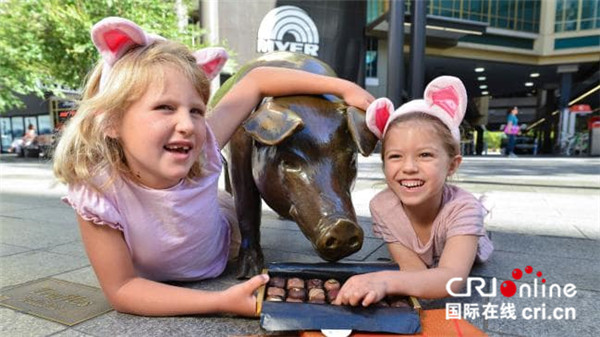 阿德萊德倫德爾購物中心門前,兩個小女孩正在品嘗黑格公司推出的豬年巧克力。