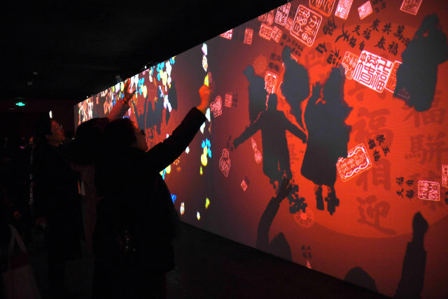 1月21日,人們體驗數字沉浸體驗展“納福迎祥”部分,張開手臂,收納從天而降的吉慶百福。