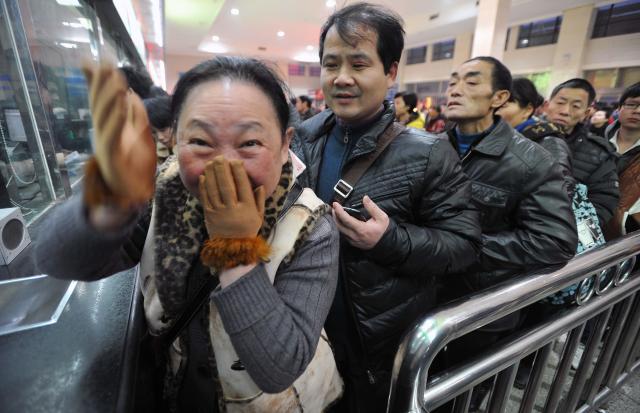 2013年,長沙火車站售票窗口前,工作人員告知一位女士當年2月14號長沙至廣州的臥鋪還有余票后,這位女士難掩喜悅。(新華社記者 李尕 攝)