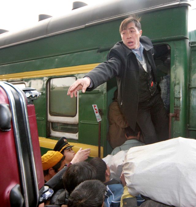 2005年春運,一位旅客準備往火車上搬運行李。