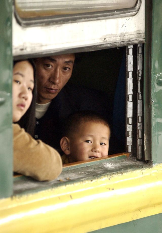 2004年,在廣州火車站登上返鄉列車的乘客通過車窗向外張望。