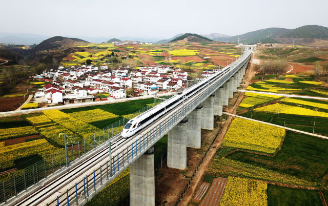 2018年3月21日,一列動車組列車行駛在西成高鐵陜西漢中洋縣段。新華社發(唐振江 攝)