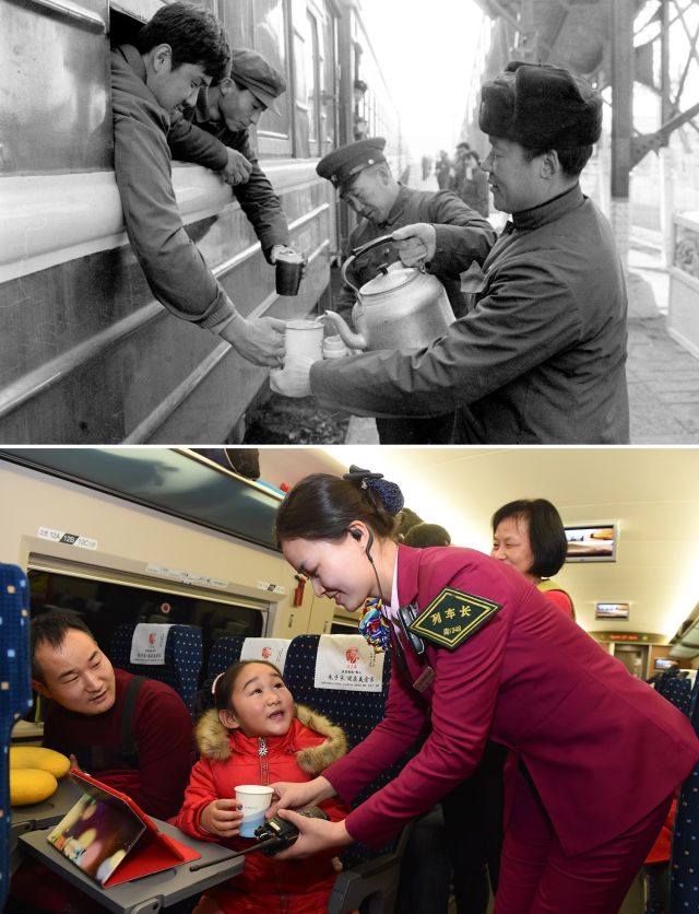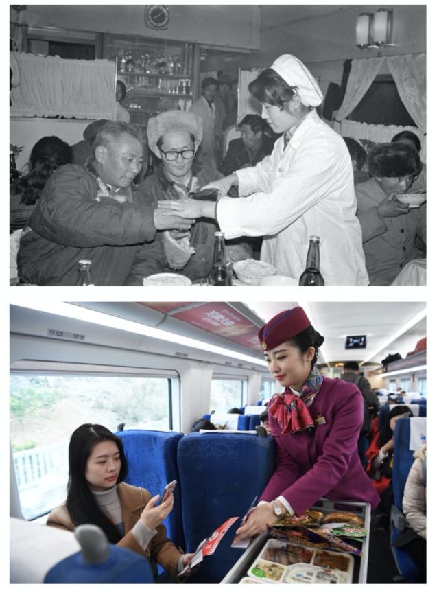 上圖:1982年,榮獲鐵道部流動優勝紅旗的呼和浩特至北京89/90次列車,在春運期間熱情為旅客服務。(新華社記者 白斯古郎 攝);下圖:2018年春運期間,乘客在重慶至成都G8510次列車上用手機支付購買小吃。(新華社記者 王全超 攝)
