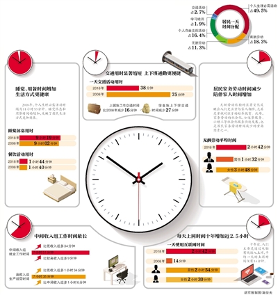 2018年,國家統(tǒng)計局組織開展了第二次全國時間利用調(diào)查,該調(diào)查覆蓋11個省(市),采用國家統(tǒng)一的住戶收支與生活狀況調(diào)查樣本框,共抽樣調(diào)查20226戶48580人。昨日,《2018年全國時間利用調(diào)查公報》出爐,結(jié)果顯示,與2008年相比,中國居民的時間分配結(jié)構(gòu)發(fā)生了較大變化,睡覺休息和用餐時間增加,收入越低的居民看電視時間越多,每天上網(wǎng)時間增加2小時28分鐘。