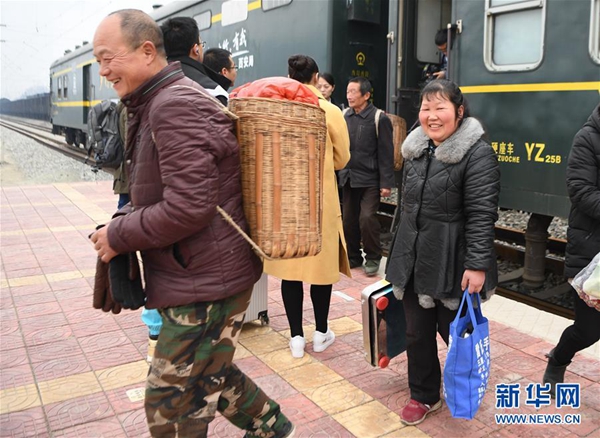 1月24日,家住漢中市寧強縣大安鎮的邵艷紅(右四)在寧強站同其他等車賣貨的村民聊天。 新華社記者 張博文 攝