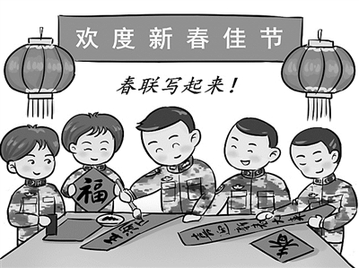 無論鄉村還是城市,春節家家戶戶都要張燈結彩。放鞭炮、貼春聯、逛廟會,其樂融融。能文能武的戰士們,此時也會提筆蘸墨,書寫、張貼春聯和“福”字,把天南海北的座座軍營裝點出濃濃年味。