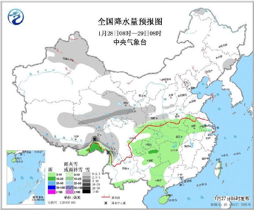 在降水方面,1月28日至30日,新疆北部、青藏高原、甘肅、寧夏、陜西中北部、山西等地部分地區將有小雪或雨夾雪,局地中雪;陜西南部、湖北北部和中西部、河南、山東中南部、蘇皖中北部等地將有雨轉雪或雨夾雪,部分地區有大到暴雪,降雪主要出現在30日夜間;湖北東部、江蘇和安徽等地局地有大雨。另外,28日至29日,云南西北部有中到大雨、局地暴雨。