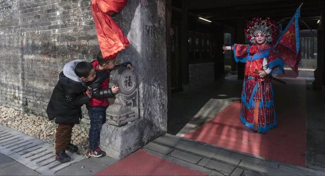 2019-02-03,山東省莒縣。兩位小朋友悄悄地趴在石獅上,期待著戲曲表演節目。作者:泉城