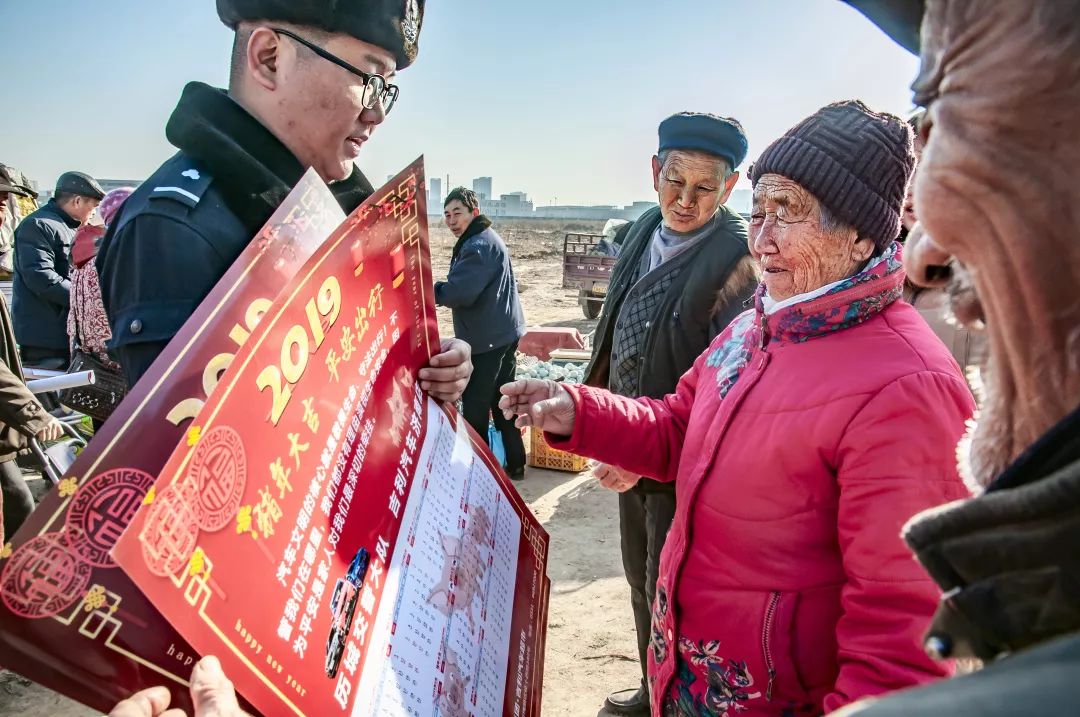 2019-02-01,山東省濟南市潘莊村。就在這家家戶戶都在忙年的時刻,交警來到集上為趕集人贈送年歷,提醒人們節日期間注意交通安全。作者:程普麟