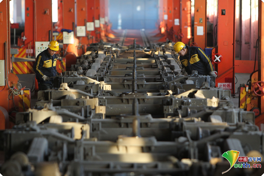 康亞斌和同事們所在的聯運檢修車間擔負著北京至烏蘭巴托、北京至莫斯科以及呼和浩特至烏蘭巴托等6趟國際旅客列車換輪任務,還要對這些車輛重要部件進行定期檢修。