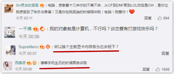 有網(wǎng)友表示,對(duì)廣大“單身狗”來說,平時(shí)陪伴自己時(shí)間最多,最了解自己的就是電腦了。因此,今天最重要的事就是為電腦慶祝生日。這條建議迅速得到其他網(wǎng)友的熱烈響應(yīng),網(wǎng)友“SupreMerio”提議,今天要為電腦更換主板顯卡和內(nèi)存條來慶祝。