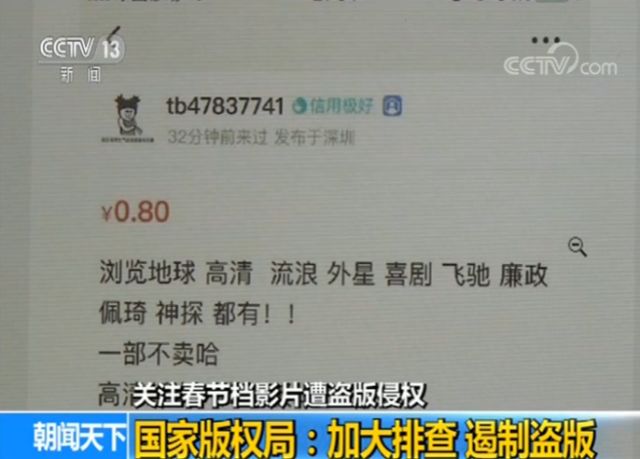 大年初一,多部不同類型和題材的國產影片集中上映,吸引了不少觀眾走進影院。以電影《流浪地球》為例,憑借觀眾口碑,截至15日下午,該片票房已突破32億元,刷新了國產電影的多項票房紀錄。不過《流浪地球》上映沒幾天,該片的盜版資源就開始通過微信朋友圈和微博等渠道在互聯網上傳播。甚至有人通過微商公然叫賣包含《流浪地球》在內的多部院線影片的盜版資源,不僅聲稱畫質“高清完整”,單部影片售價低至1元不到,打包購買還能享受優惠。