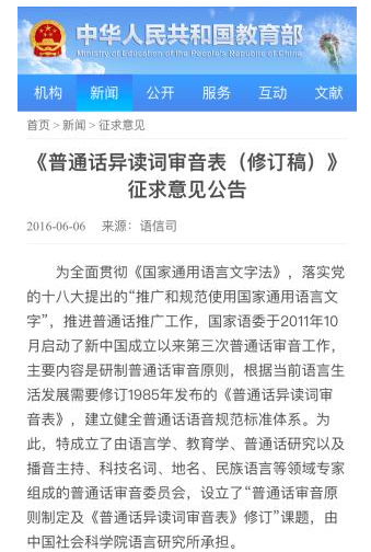 1985年,國家發(fā)布《普通話異讀詞審音表》,對(duì)一些異讀詞進(jìn)行了修訂。2016發(fā)布的《<普通話異讀詞審音表(修訂稿)>征求意見稿》又對(duì)一些讀音進(jìn)行了新的修訂,并發(fā)布在教育部網(wǎng)站上征求意見。