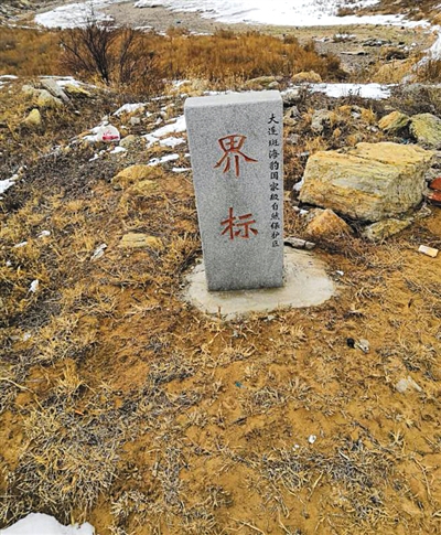 長興島上的大連斑海豹國家級自然保護區界碑。受訪者供圖
