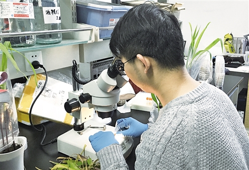 一名學生在實驗室對玉米苗進行真菌樣本采集。 記者 沈慧 攝