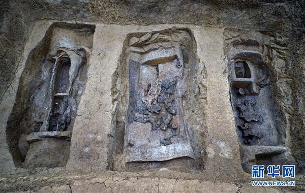 這是湖北沙洋城河新石器時代遺址出土的葬具及部分隨葬品(資料照片)。新華社發(fā)