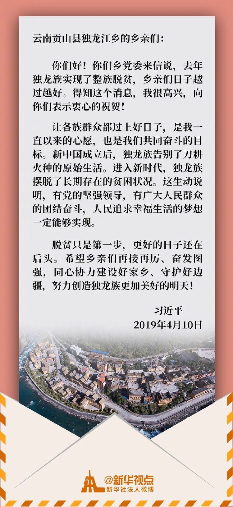 這一天,習(xí)近平總書(shū)記給他們回信??倳?shū)記在信中祝賀獨(dú)龍族實(shí)現(xiàn)整族脫貧,勉勵(lì)鄉(xiāng)親們?yōu)檫^(guò)上更加幸福美好的生活繼續(xù)團(tuán)結(jié)奮斗。