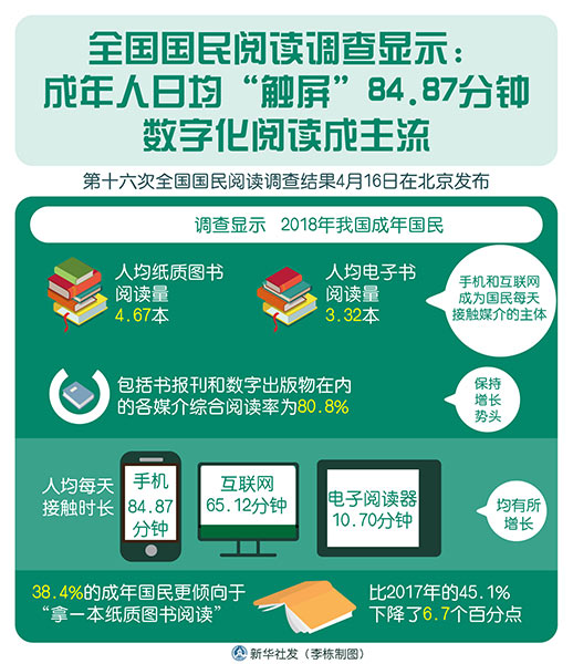 新華社北京4月16日電(記者 史競男)第十六次全國國民閱讀調查結果16日在京發布。調查顯示,2018年我國成年國民人均紙質圖書閱讀量為4.67本、電子書閱讀量為3.32本,手機和互聯網成為國民每天接觸媒介的主體,紙質書報刊的閱讀時長均有所減少。