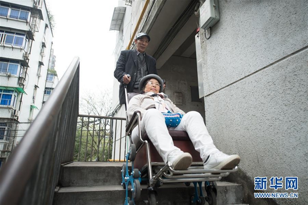 4月11日,在桐廬縣桐君街道,老伴陳洪明推著吳素環下樓前往中國盲文圖書館桐廬縣支館為視障人士解說電影《可可西里》。新華社記者 翁忻旸 攝