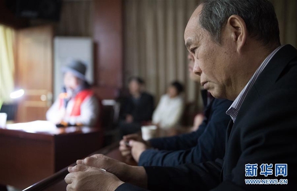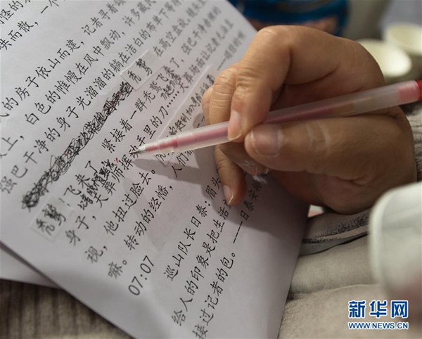 4月11日,吳素環在中國盲文圖書館桐廬縣支館修改電影《可可西里》的解說稿。新華社記者 翁忻旸 攝