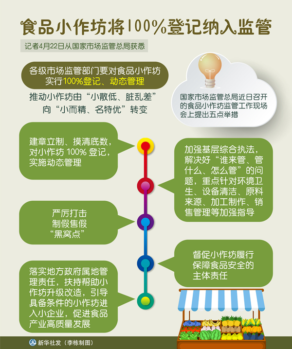 新華社北京4月22日電(記者趙文君)記者22日從國家市場監(jiān)管總局獲悉,各級市場監(jiān)管部門要對食品小作坊實(shí)行100%登記、動(dòng)態(tài)管理,推動(dòng)小作坊由“小散低、臟亂差”向“小而精、名特優(yōu)”轉(zhuǎn)變。
