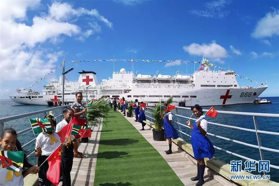 2018年10月12日,在多米尼克首都羅索,當地學生揮動多中兩國國旗歡迎中國海軍和平方舟醫院船首次到訪。新華社發(江山 攝)