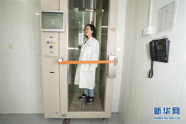 在中核集團(tuán)中國(guó)原子能科學(xué)研究院,媒體記者在參觀完中國(guó)先進(jìn)研究堆后,都要經(jīng)過(guò)一個(gè)特別的安檢門(mén),通過(guò)檢測(cè)確定沒(méi)有受到輻射污染才能夠離開(kāi)(4月17日攝)。新華社記者 才揚(yáng) 攝