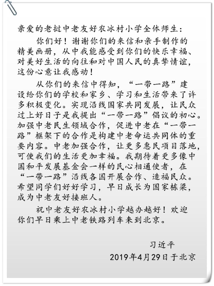 在來信的最后,中老友好農(nóng)冰村小學(xué)師生提及讓他們滿心期待的中老鐵路,希望以后能夠乘坐中老鐵路的列車去北京看看。