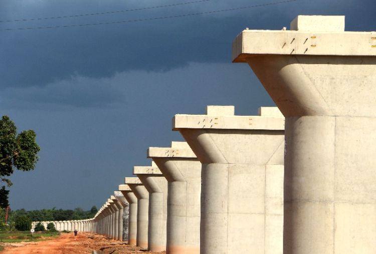 ↑2018年6月14日的老撾萬象楠科內(nèi)河特大橋橋墩。墩身澆筑完成標(biāo)志著中老鐵路全線最長橋梁主體工程順利完工。 新華社發(fā)