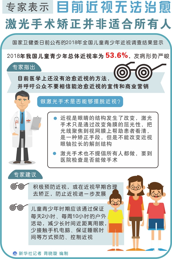 新華社北京5月3日電(記者王秉陽(yáng)、溫競(jìng)?cè)A)國(guó)家衛(wèi)健委日前公布的2018年全國(guó)兒童青少年近視調(diào)查結(jié)果顯示,2018年我國(guó)兒童青少年總體近視率為53.6%,發(fā)病形勢(shì)嚴(yán)峻。有的家長(zhǎng)寄希望于近視后的治療,而且有不少商家宣稱(chēng)可治愈近視。專(zhuān)家指出,目前醫(yī)學(xué)上還沒(méi)有治愈近視的方法,并呼吁公眾不要相信能治愈近視的宣傳和商業(yè)營(yíng)銷(xiāo)。