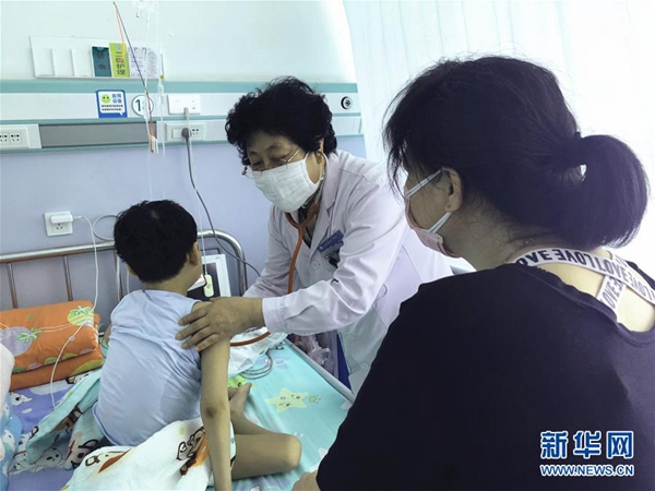 劉建平在給血液病患兒做日常檢查(資料照片)。新華社發