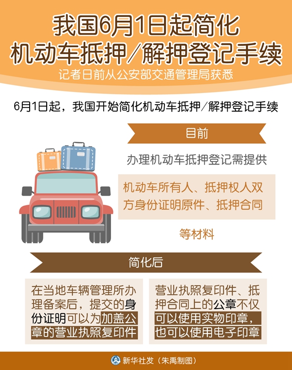 新華社北京5月28日電(記者王茜)6月1日起,我國開始簡化機動車抵押/解押登記手續(xù)。這是記者日前從公安部交通管理局獲悉的。