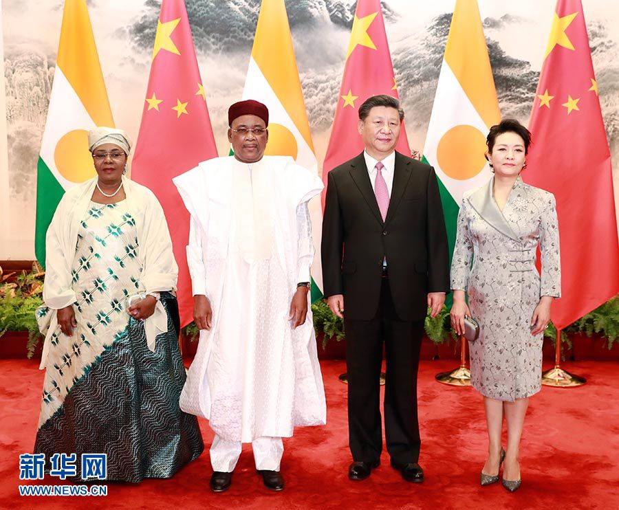 5月28日,國家主席習近平在北京人民大會堂同尼日爾總統伊素福舉行會談。這是習近平和夫人彭麗媛同伊素福夫婦合影。 新華社記者 龐興雷 攝