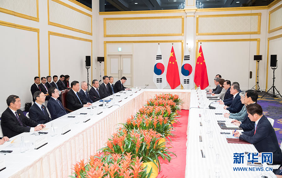 習近平指出,加強中韓友好合作符合歷史潮流,也是兩國人心所向。中方愿同韓方堅持以誠相待,努力實現(xiàn)合作共贏,推動兩國關系不斷向前發(fā)展,并為朝鮮半島和地區(qū)和平穩(wěn)定作出貢獻。雙方要保持各層次溝通,把穩(wěn)雙邊關系發(fā)展大方向。要把握共建“一帶一路”機遇,加快中韓自由貿(mào)易協(xié)定第二階段談判,不斷擴大貿(mào)易、科技、財經(jīng)、環(huán)保等領域合作。要積極開展人文交流,鞏固中韓民間友好。中韓合作完全是互利雙贏的,不應該受到外部壓力影響。希望韓方繼續(xù)重視、妥善處理好兩國間有關問題。雙方要加強在聯(lián)合國、二十國集團等多邊框架內(nèi)的協(xié)調(diào),共同反對保護主義,支持多邊主義和自由貿(mào)易體制,推動構建開放型世界經(jīng)濟。