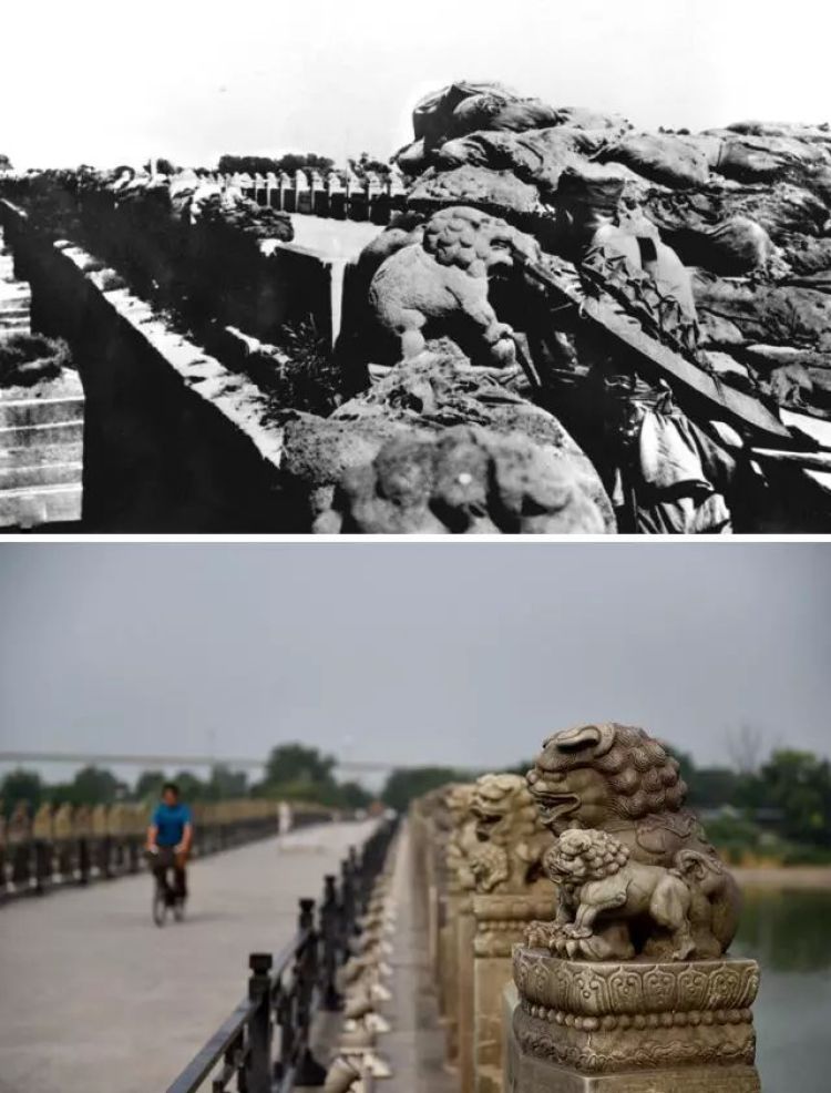 上圖為守衛盧溝橋的29軍士兵抵抗日本侵略軍入侵(資料照片);下圖為2017年7月3日拍攝的盧溝橋(新華社記者 張晨霖 攝)。